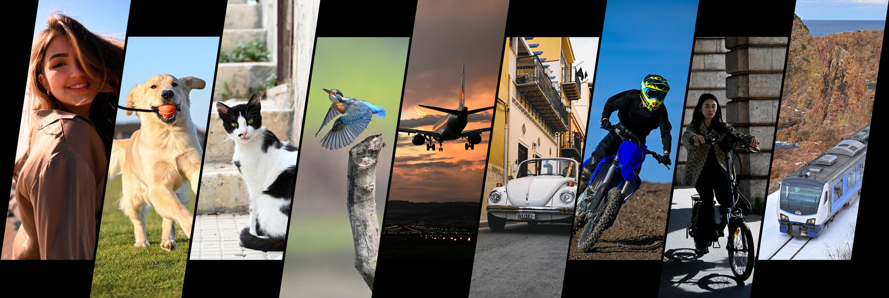 People, cats, dogs, birds, airplanes, motorbikes, vehicles, bicycles and trains.